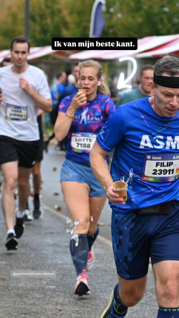 Maar hey, ik liep mijn eigen race, doorpakken nu! Op Strijp-S was het een feest van bekenden die me aan stonden te moedigen en voelde ik me weer een winnaar. Ik zette een tandje bij richting stad. Bij het stadion stond loopmaatje Yarka zichzelf binnenstebuiten te juichen, weer een boost!