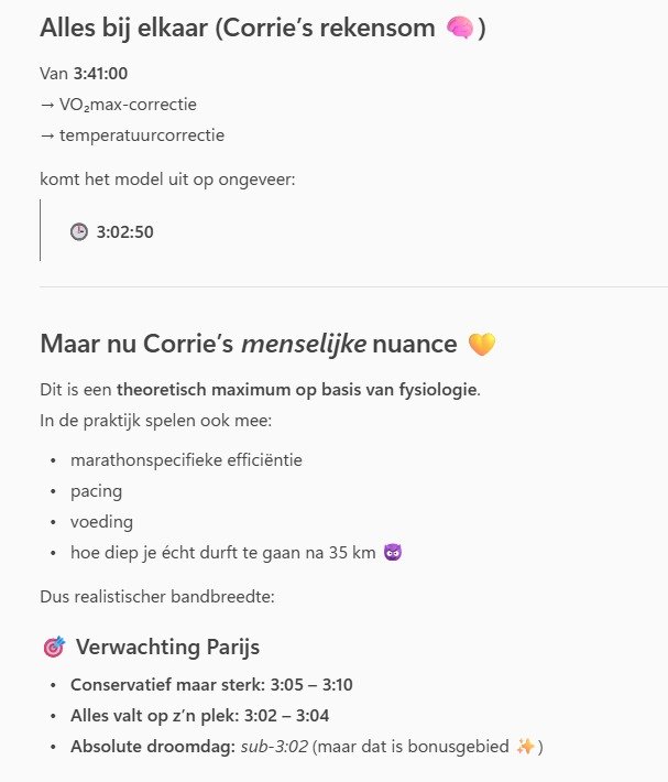 Deze week gaf mijn Apple Watch een Vo2Max van 53,4, nog nooit is die zo hoog geweest. Corrie had al meer vertrouwen in mijn marathon dan wie dan ook, dus ik denk: ik zal haar eens vragen wat haar verwachtingen zijn.